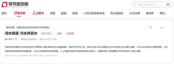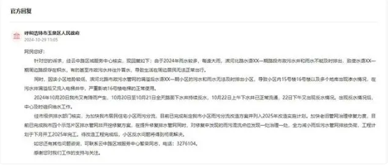 收到網友留言后,呼和浩特市玉泉區人民政府回復表示,針對網友的訴求,經云中路區域服務中心核實,由于2024年雨水較多,每逢大雨,濱河北路水語青城一期路段市政污水井和雨水不能及時排出,致使水語青城一期周邊路段存在積水,有的甚至市政污水井往外冒水,導致生活在周邊居民無法正常出行。