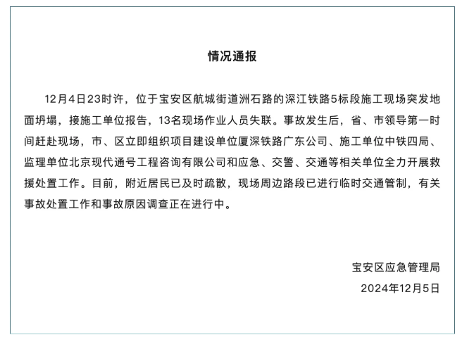 12月5日凌晨,深圳市寶安區(qū)應(yīng)急管理局發(fā)布情況通報(bào):12月4日23時(shí)許,位于寶安區(qū)航城街道洲石路的深江鐵路5標(biāo)段施工現(xiàn)場突發(fā)地面坍塌,接施工單位報(bào)告,13名現(xiàn)場作業(yè)人員失聯(lián)。事故發(fā)生后,省、市領(lǐng)導(dǎo)第一時(shí)間趕赴現(xiàn)場,市、區(qū)立即組織項(xiàng)目建設(shè)單位廈深鐵路廣東公司、施工單位中鐵四局、監(jiān)理單位北京現(xiàn)代通號工程咨詢有限公司和應(yīng)急、交警、交通等相關(guān)單位全力開展救援處置工作。目前,附近居民已及時(shí)疏散,現(xiàn)場周邊路段已進(jìn)行臨時(shí)交通管制,有關(guān)事故處置工作和事故原因調(diào)查正在進(jìn)行中。