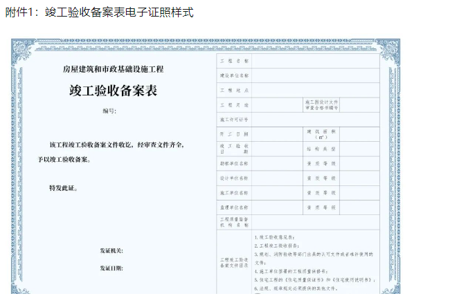 全省范圍內的房屋建筑和市政基礎設施工程項目在辦理竣工驗收備案時,全面實行電子證照(證照樣式見附件1,標準板式見附件2)。 電子證照與紙質證照具有同等法律效力。 自2024年12月10日起,各級竣工驗收備案機關原則上不再制作和發放紙質版竣工驗收備案表。