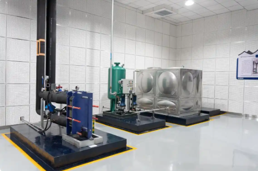 在城北凈水廠,有一位大家共同的“工作搭子”——污水源熱泵系統。這套全年無休的“冷暖管家”,以污水處理后的尾水作為提取能量的熱源,借助熱泵機組實現變廢為寶的綠色循環:它所產生的能量能夠為辦公區域提供夏季制冷、冬季供暖服務;每天能夠加熱產出60立方米55℃的熱水,供廠區使用;在冬季,還能夠滿足PAM加藥的加熱需求,確保工序穩定運行。這套系統通過污水熱源再利用,節約電能消耗,降低碳排放量,以科技硬實力踐行了綠色低碳的理念。