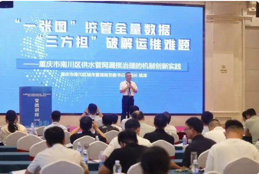 值得關注的是,重慶市南川區(qū)城市管理局黨委書記、局長姚濤應邀在會上分享南川區(qū)公共供水管網(wǎng)漏損治理經(jīng)驗。姚濤以“一張圖統(tǒng)管全量數(shù)據(jù),三方擔破解運維難題”為主題,詳細闡述了南川區(qū)在公共供水管網(wǎng)漏損治理方面的機制創(chuàng)新。以破冰、破局、破浪為主線,圍繞數(shù)據(jù)筑基、機制破題等核心要點,為大家全面匯報了南川區(qū)在山地城市供水管網(wǎng)漏損治理復雜環(huán)境中的探索與實踐。