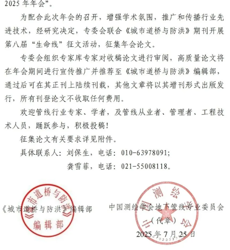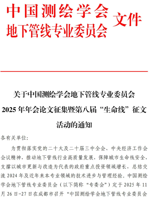 為配合中國測(cè)繪學(xué)會(huì)地下管線專業(yè)委員會(huì)2025年年會(huì)召開,經(jīng)研究決定開展第八屆“生命線”征文活動(dòng),現(xiàn)將具體事宜通知如下:
